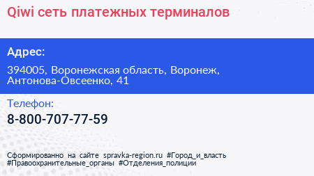 Qiwi, сеть платежных терминалов по адресу 394005, Воронежская область, Воронеж, Антонова-Овсеенко, 41 в дальнейшем Организация, размещена в следующих категориях: