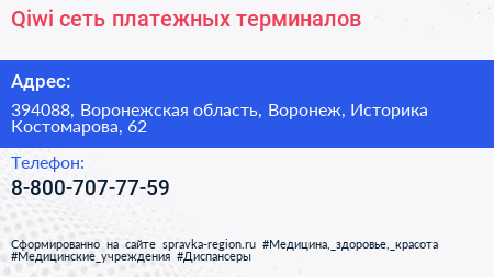 Qiwi, сеть платежных терминалов по адресу 394088, Воронежская область, Воронеж, Историка Костомарова, 62 в дальнейшем Организация, размещена в следующих категориях: