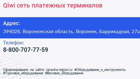 Qiwi, сеть платежных терминалов по адресу 394028, Воронежская область, Воронеж, Баррикадная, 27а в дальнейшем Организация, размещена в следующих категориях: