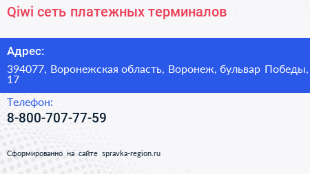 Qiwi, сеть платежных терминалов по адресу 394077, Воронежская область, Воронеж, бульвар Победы, 17 в дальнейшем Организация, размещена в следующих категориях: