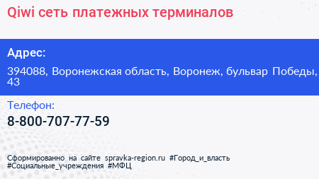Qiwi, сеть платежных терминалов по адресу 394088, Воронежская область, Воронеж, бульвар Победы, 43 в дальнейшем Организация, размещена в следующих категориях: