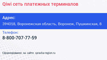 Qiwi, сеть платежных терминалов по адресу 394018, Воронежская область, Воронеж, Пушкинская, 8 в дальнейшем Организация, размещена в следующих категориях: