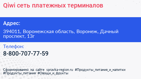 Qiwi, сеть платежных терминалов по адресу 394011, Воронежская область, Воронеж, Дачный проспект, 13г в дальнейшем Организация, размещена в следующих категориях:
