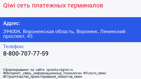 Qiwi, сеть платежных терминалов по адресу 394004, Воронежская область, Воронеж, Ленинский проспект, 45 в дальнейшем Организация, размещена в следующих категориях: