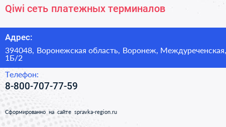 Qiwi, сеть платежных терминалов по адресу 394048, Воронежская область, Воронеж, Междуреченская, 1Б/2 в дальнейшем Организация, размещена в следующих категориях: