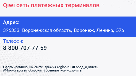 Qiwi, сеть платежных терминалов по адресу 396333, Воронежская область, Воронеж, Ленина, 57а в дальнейшем Организация, размещена в следующих категориях:
