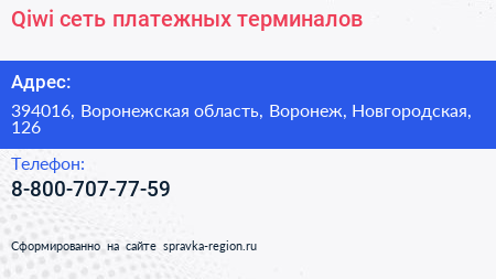 Qiwi, сеть платежных терминалов по адресу 394016, Воронежская область, Воронеж, Новгородская, 126 в дальнейшем Организация, размещена в следующих категориях: