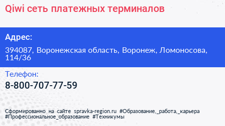 Qiwi, сеть платежных терминалов по адресу 394087, Воронежская область, Воронеж, Ломоносова, 114/36 в дальнейшем Организация, размещена в следующих категориях: