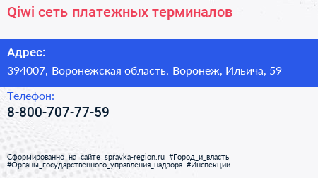Qiwi, сеть платежных терминалов по адресу 394007, Воронежская область, Воронеж, Ильича, 59 в дальнейшем Организация, размещена в следующих категориях: