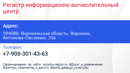 Регистр, информационно-вычислительный центр по адресу 394088, Воронежская область, Воронеж, Антонова-Овсеенко, 35в в дальнейшем Организация, размещена в следующих категориях: