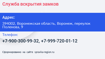 Служба вскрытия замков по адресу 394002, Воронежская область, Воронеж, переулок Поленова, 9 в дальнейшем Организация, размещена в следующих категориях: