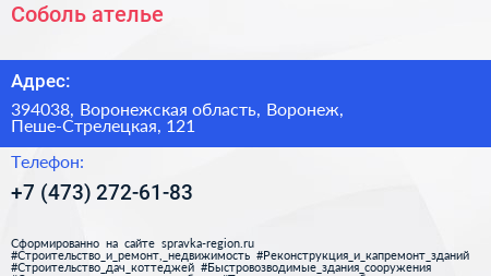 Соболь, ателье по адресу 394038, Воронежская область, Воронеж, Пеше-Стрелецкая, 121 в дальнейшем Организация, размещена в следующих категориях: