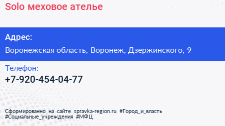 Solo, меховое ателье по адресу Воронежская область, Воронеж, Дзержинского, 9 в дальнейшем Организация, размещена в следующих категориях: