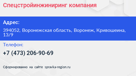 Спецстройинжиниринг, компания по адресу 394052, Воронежская область, Воронеж, Кривошеина, 13/9 в дальнейшем Организация, размещена в следующих категориях: