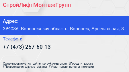 СтройЛифтМонтажГрупп по адресу 394036, Воронежская область, Воронеж, Арсенальная, 3 в дальнейшем Организация, размещена в следующих категориях: