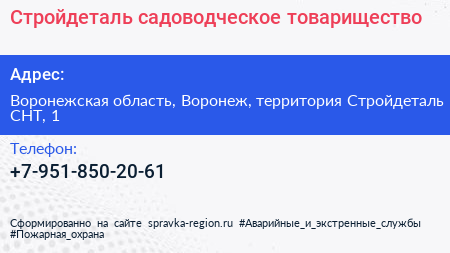 Стройдеталь, садоводческое товарищество по адресу Воронежская область, Воронеж, территория Стройдеталь СНТ, 1 в дальнейшем Организация, размещена в следующих категориях: