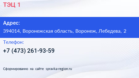 ТЭЦ-1 по адресу 394014, Воронежская область, Воронеж, Лебедева, 2 в дальнейшем Организация, размещена в следующих категориях: