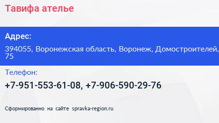 Тавифа, ателье по адресу 394055, Воронежская область, Воронеж, Домостроителей, 75 в дальнейшем Организация, размещена в следующих категориях: