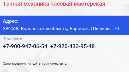 Точная механика, часовая мастерская по адресу 394068, Воронежская область, Воронеж, Шишкова, 70 в дальнейшем Организация, размещена в следующих категориях: