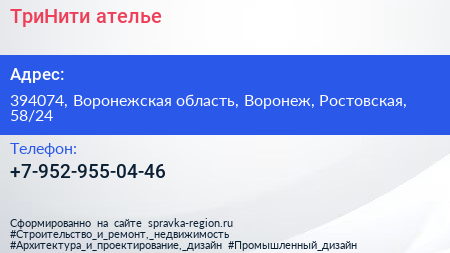 ТриНити, ателье по адресу 394074, Воронежская область, Воронеж, Ростовская, 58/24 в дальнейшем Организация, размещена в следующих категориях: