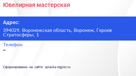 Ювелирная мастерская по адресу 394029, Воронежская область, Воронеж, Героев Стратосферы, 1 в дальнейшем Организация, размещена в следующих категориях: