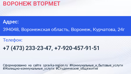 ВОРОНЕЖ-ВТОРМЕТ по адресу 394048, Воронежская область, Воронеж, Курчатова, 24г в дальнейшем Организация, размещена в следующих категориях:
