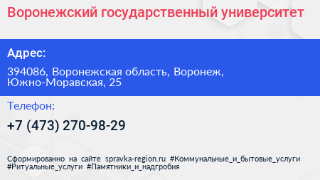 Воронежский государственный университет по адресу 394086, Воронежская область, Воронеж, Южно-Моравская, 25 в дальнейшем Организация, размещена в следующих категориях: