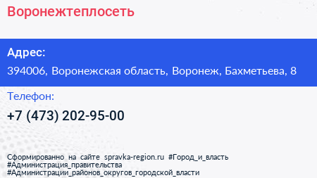 Воронежтеплосеть по адресу 394006, Воронежская область, Воронеж, Бахметьева, 8 в дальнейшем Организация, размещена в следующих категориях: