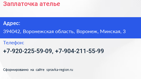 Заплаточка, ателье по адресу 394042, Воронежская область, Воронеж, Минская, 3 в дальнейшем Организация, размещена в следующих категориях: