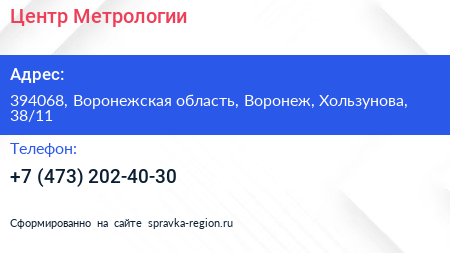 Центр Метрологии по адресу 394068, Воронежская область, Воронеж, Хользунова, 38/11 в дальнейшем Организация, размещена в следующих категориях: