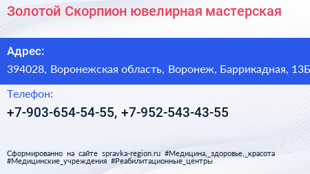 Золотой Скорпион, ювелирная мастерская по адресу 394028, Воронежская область, Воронеж, Баррикадная, 13Б в дальнейшем Организация, размещена в следующих категориях:
