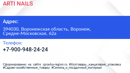 ARTI NAILS по адресу 394030, Воронежская область, Воронеж, Средне-Московская, 62а в дальнейшем Организация, размещена в следующих категориях:
