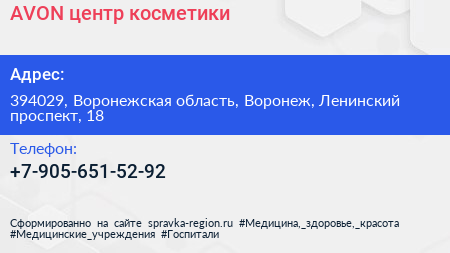 AVON, центр косметики по адресу 394029, Воронежская область, Воронеж, Ленинский проспект, 18 в дальнейшем Организация, размещена в следующих категориях: