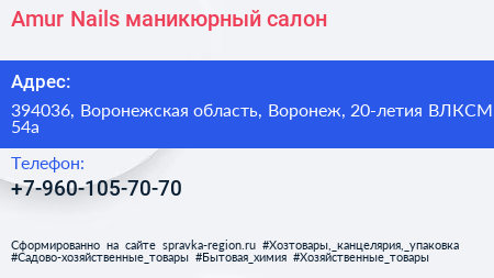 Amur Nails, маникюрный салон по адресу 394036, Воронежская область, Воронеж, 20-летия ВЛКСМ, 54а в дальнейшем Организация, размещена в следующих категориях: