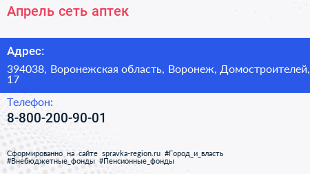 Апрель, сеть аптек по адресу 394038, Воронежская область, Воронеж, Домостроителей, 17 в дальнейшем Организация, размещена в следующих категориях: