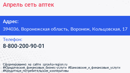 Апрель, сеть аптек по адресу 394036, Воронежская область, Воронеж, Кольцовская, 17 в дальнейшем Организация, размещена в следующих категориях: