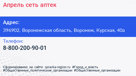 Апрель, сеть аптек по адресу 396902, Воронежская область, Воронеж, Курская, 40а в дальнейшем Организация, размещена в следующих категориях: