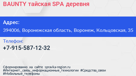 BAUNTY, тайская SPA-деревня по адресу 394006, Воронежская область, Воронеж, Кольцовская, 35 в дальнейшем Организация, размещена в следующих категориях: