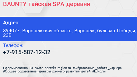 BAUNTY, тайская SPA-деревня по адресу 394077, Воронежская область, Воронеж, бульвар Победы, 23Б в дальнейшем Организация, размещена в следующих категориях: