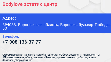 Bodylove, эстетик-центр по адресу 394088, Воронежская область, Воронеж, бульвар Победы, 50 в дальнейшем Организация, размещена в следующих категориях: