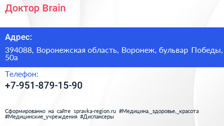 Доктор Brain по адресу 394088, Воронежская область, Воронеж, бульвар Победы, 50а в дальнейшем Организация, размещена в следующих категориях: