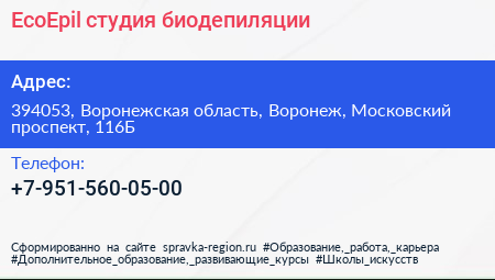 EcoEpil, студия биодепиляции по адресу 394053, Воронежская область, Воронеж, Московский проспект, 116Б в дальнейшем Организация, размещена в следующих категориях: