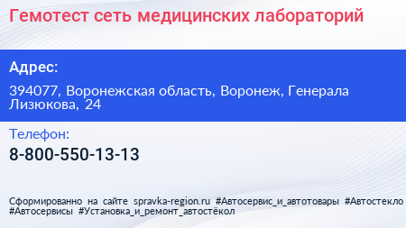 Гемотест, сеть медицинских лабораторий по адресу 394077, Воронежская область, Воронеж, Генерала Лизюкова, 24 в дальнейшем Организация, размещена в следующих категориях: