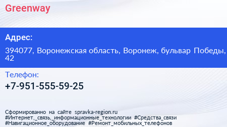 Greenway по адресу 394077, Воронежская область, Воронеж, бульвар Победы, 42 в дальнейшем Организация, размещена в следующих категориях: