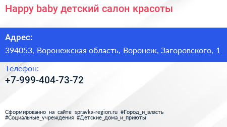 Happy baby, детский салон красоты по адресу 394053, Воронежская область, Воронеж, Загоровского, 1 в дальнейшем Организация, размещена в следующих категориях:
