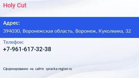 Holy Cut по адресу 394030, Воронежская область, Воронеж, Куколкина, 32 в дальнейшем Организация, размещена в следующих категориях: