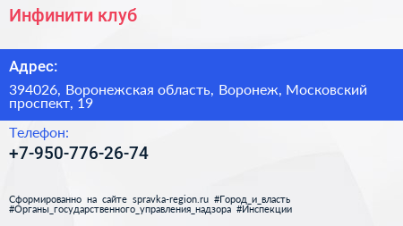 Инфинити, клуб по адресу 394026, Воронежская область, Воронеж, Московский проспект, 19 в дальнейшем Организация, размещена в следующих категориях: