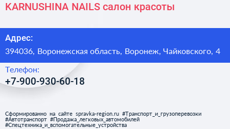 KARNUSHINA NAILS, салон красоты по адресу 394036, Воронежская область, Воронеж, Чайковского, 4 в дальнейшем Организация, размещена в следующих категориях: