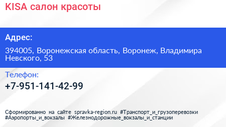 KISA, салон красоты по адресу 394005, Воронежская область, Воронеж, Владимира Невского, 53 в дальнейшем Организация, размещена в следующих категориях: