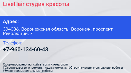 LiveHair, студия красоты по адресу 394036, Воронежская область, Воронеж, проспект Революции, 7 в дальнейшем Организация, размещена в следующих категориях:
